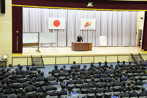矢部理事長・学校長の年頭挨拶では「日本の教育資格枠組みについて専門学校のレベルが大学と同等になる」ことや「学生個々については今年の抱負や決意をぜひ達成できるよう努力・研鑚していただきたい」と学生達を鼓舞激励しました。