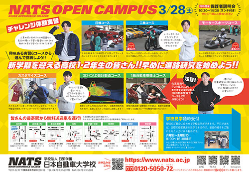 新学年への進級前にオープンキャンパスに参加して、将来の自分探しをしてみませんか!実際にクルマやバイクを見て・乗って・触れて、楽しく体験できます!先生が常にフォローするので、初めての方でも安心して挑戦できます!夢中になり過ぎて時間が経つのもあっという間ですョ!ご家族やご友人を誘って、ぜひ参加くださいネ!